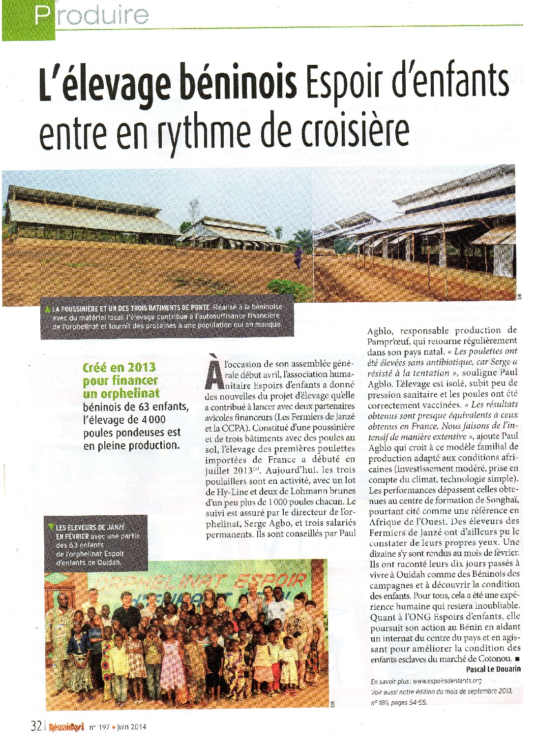 Le magazine présente ensuite les résultats qu’ont constaté de visu le groupe d’éleveurs des Poulets de Janzé, lors de leur voyage de Février, et de leurs témoignages lors de la dernière assemblée générale. Il termine son article en mentionnant l’action d’Espoirs d’Enfants en faveur de l’orphelinat de Guinagourou, avant d’évoquer le projet Enfants Esclaves.